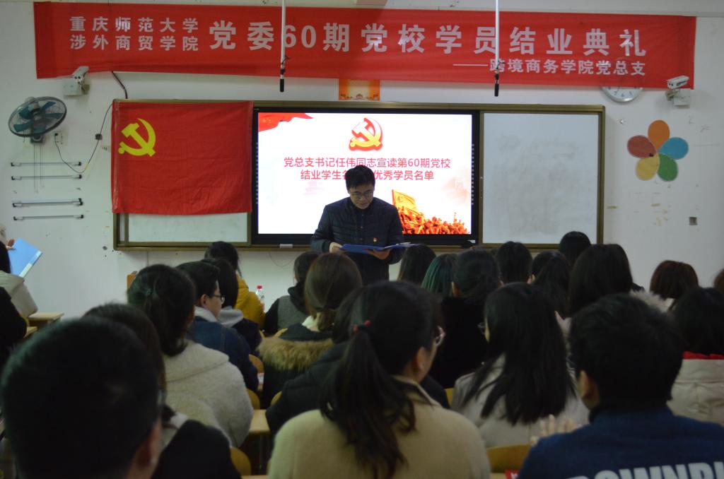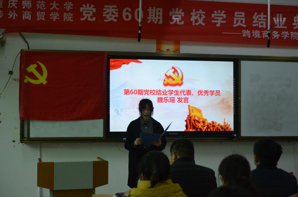 结业典礼在雄壮的歌声中拉开帷幕。首先由公司党总支书记任伟同志致辞并宣读《重师商公司党委60期党校太阳成集团tyc234cc结业名单》及优秀学员名单。任书记勉励结业学员把党校学习内容内化于心、外化于行、固化于规,用实际行动争取早日入党。