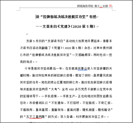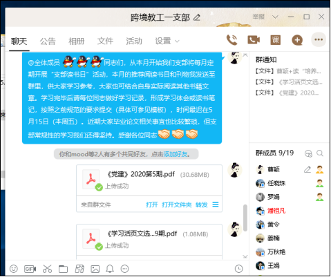 此次活动设置好书推荐、线上阅读、分享心得等环节。在活动中,支部党员和入党积极分子对照支部的安排对相关书籍刊物进行了选读,并互相学习分享了《中国特色社会主义纵横谈》《党员党建(第2版)》、《党建》(2020第5期)、《学习活页文选》(2020年第19期)等优秀读物。