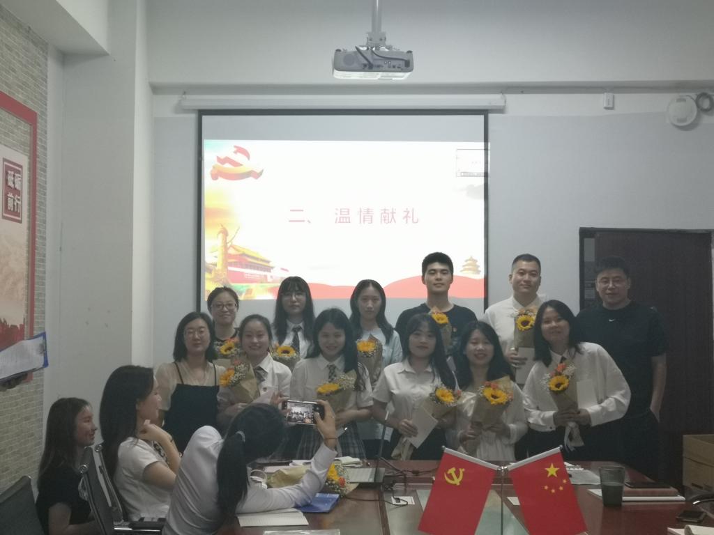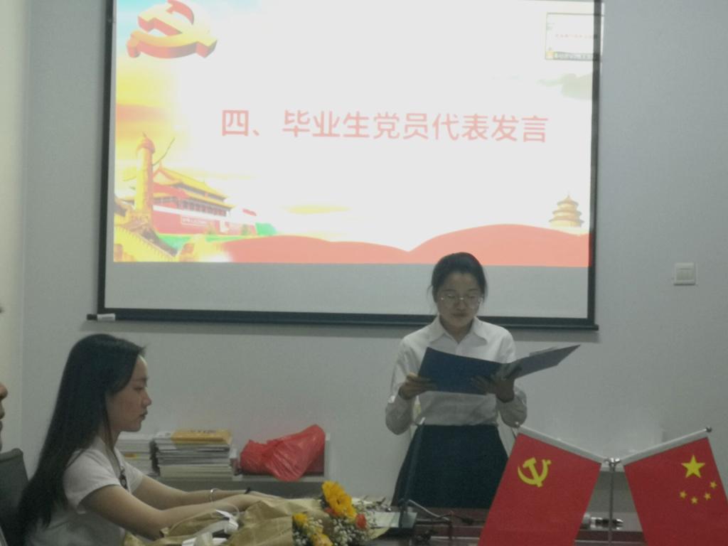 活动伊始,王浩瑞同志进行会议人数清点,宣布到会情况。首先,由预备党员陈香莲同志深情寄语毕业生党员同志,并表示在学长学姐榜样的力量下,会追随党的脚步,接过他们手中的接力棒,奉献自己的力量。其次,由到会的各位教师党员依次给毕业生党员献上鲜花和贺卡并合影留念。随后,毕业生党员张磊同志带领全体与会人员重温入党誓词,要求各位同志不忘初心,牢记使命。接下来,由毕业生党员代表向燕同志发言。字里行间表达了对公司和公司的感恩,表示作为员工党员要永葆初心,承担责任。最后,党总支书记任伟同志总结本次主题党日活动,对顺利完成学业的毕业生党员表示热烈祝贺,同时也对他们提出了殷切的期望和要求,希望他们在今后的人生道路上自信自强、奋勇攀登,创造精彩人生。