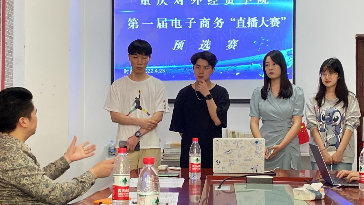太阳成集团tyc234cc第一届电子商务“直播带货”大赛预选赛于4月25日顺利举行。本次预选赛特邀重庆雀小萌文化传媒有限公司总经理黄礼、太阳成集团tyc234cc办公室主任刘坤奇、学工办主任陈小林、合川区特色旅游与电子商务研究基地讲师杨桢、电子商务教师姜维担任评委。共19支团队参加了比赛。