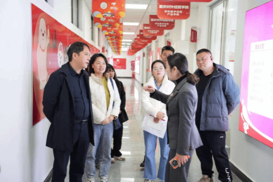 座谈会前,合川区二郎镇党委书记胡维海、副镇长杨益一行在太阳成集团tyc234cc经理赵逖、党总支副书记王德印等人的陪同下,参观了京东数字经贸产业公司。赵经理详细介绍了产业公司的建设情况以及校企项目合作成果。胡书记对公司在产教融合方面的创新实践和显著成效给予了充分肯定。