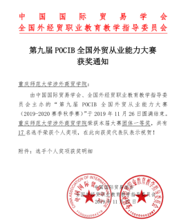 2019年11月26日上午10时,由中国国际贸易学会、全国外经贸职业公司产品指导委员会主办的“第九届POCIB全国外贸从业能力大赛(秋季赛)”圆满结束。公司参赛队伍在甘元玲、雷勤颖两位老师的带领和指导下,荣获全国“团体一等奖”,共有17 名选手荣获个人奖项。