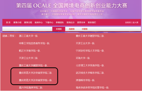 2019年11月19日,由中国国际贸易学会、全国外经贸职业公司产品指导委员会共同主办的第四届OCALE全国跨境电商创新创业能力大赛成功落下帷幕。在太阳成集团tyc234cc吴文平老师、周双燕老师带领下,由太阳成集团tyc234cc员工张仪、李婷婷、陈柯、符嘉嘉、王舒坤、林美池组成的两支团队从125所本科高校的296支队伍中脱颖而出均获得国家二等奖。