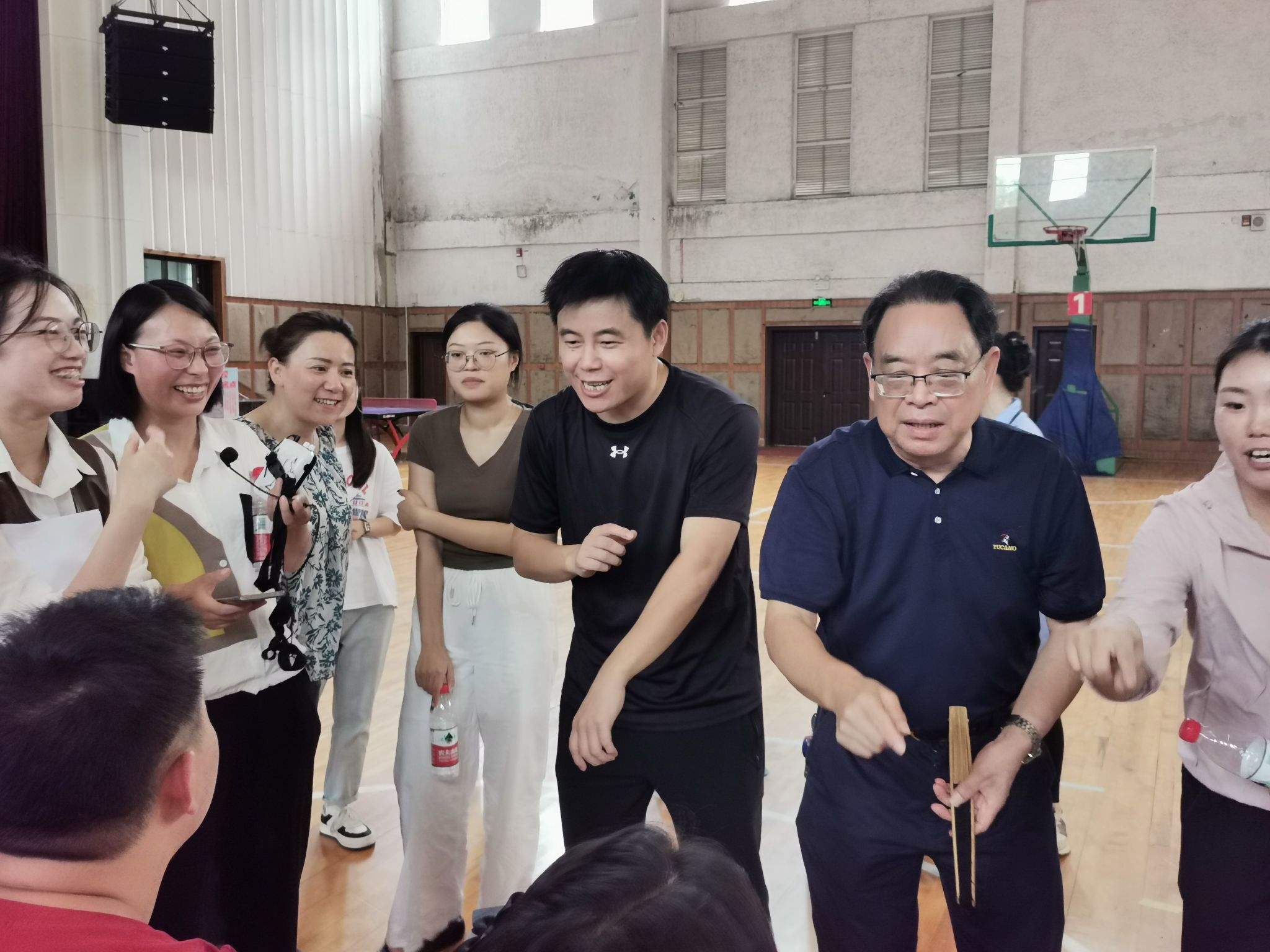 在“筷”乐传递游戏中,老师们小心翼翼用筷子传递乒乓球,彼此鼓励,默契配合,让全场气氛瞬间燃起来;在“篮”不倒你游戏中,老师们手脚并用、花样过关,依次通过拍篮球、踢毽子、跳绳障碍,铆足劲为团队获胜而努力,气氛紧张又有趣;在“你比划我猜”游戏中,老师们手舞足蹈、滔滔不绝,使出浑身解数表达词汇,瞬间将活动氛围推向高潮。