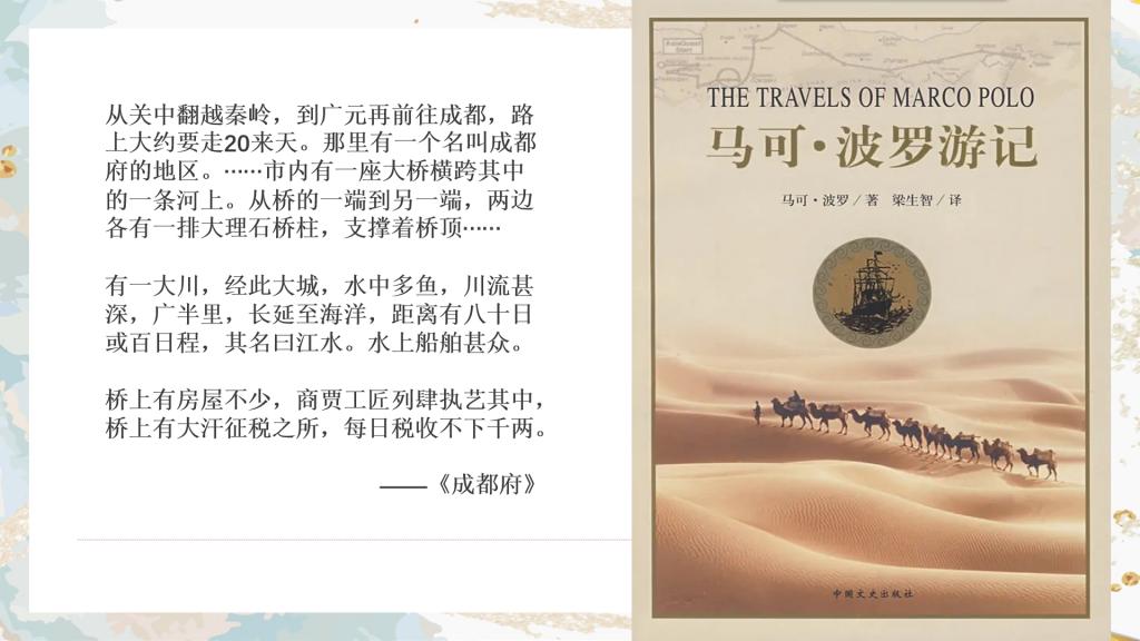 小渝、小欧不仅向马可·波罗介绍了他后来创作的《马可·波罗游记》,还向他介绍了“一带一路”倡议,向他介绍了二十一世纪的中国在对外贸易上的发展,尤其介绍了中欧班列中的渝新欧班列。