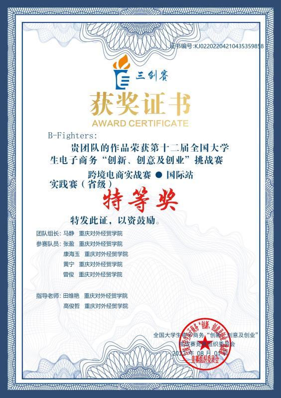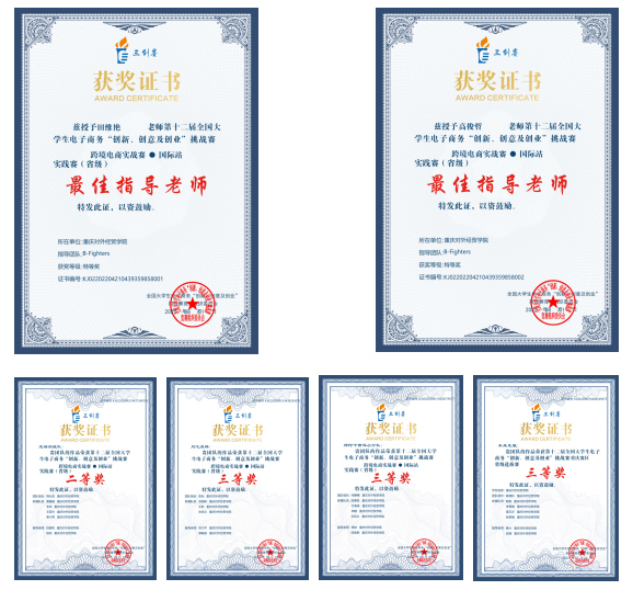 2022年7月24日,第十二届全国老员工电子商务“创新、创意及创业”挑战赛在湖北经济公司落下帷幕。公司十支创业团队在田维艳、高俊哲、舒秘、吴文平、黄令、杨帧、段瑞、郭峻辰8位老师的指导下,1支团队获得重庆市“特等奖”,1支团队获得重庆市“二等奖”,3支团队获得重庆市“三等奖”,两名老师获得重庆市“最佳指导老师”荣誉称号。